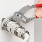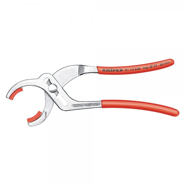 דגם 8113230, תוצרת חברת KNIPEX. פלייר לצינורות עדינים (מצופים, מחומרים רכים) ומחברי אלקטרוניקה. לחיים קעורות מפלסטיק למגע עדין, כיוון מהיר בלחיצת כפתור. טווח פתיחה ø10-75 מ”מ, 25 נקודות כיוונון. כלי חזק במיוחד מחושל מפלדת כרום ונדיום ומחוסם בשמן. ציפוי כרום, ידיות עם בידוד קל נגד החלקה. אורך הכלי: 250 מ”מ.